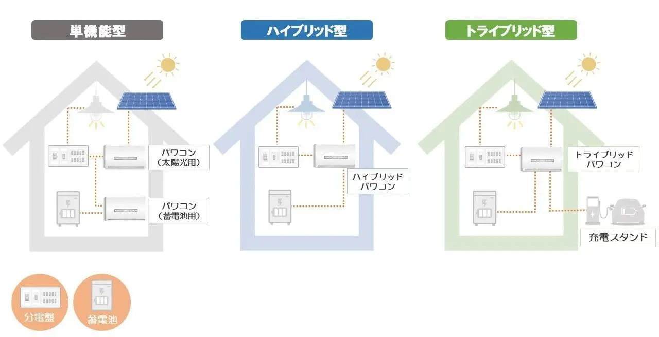 | トライブリッド型 | 太陽光パネル・蓄電池・EV充電スタンドのパワコンを1台で共通 |