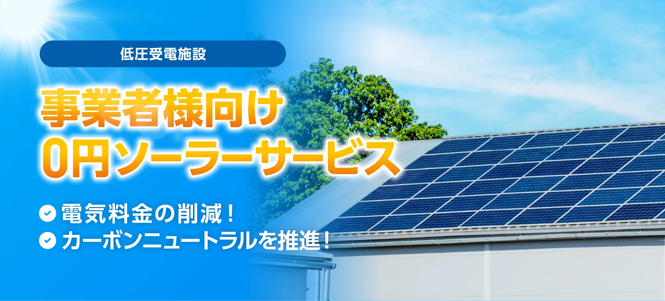 お客様の施設(低圧受電施設)へ太陽光発電設備を無償で設置いたします。